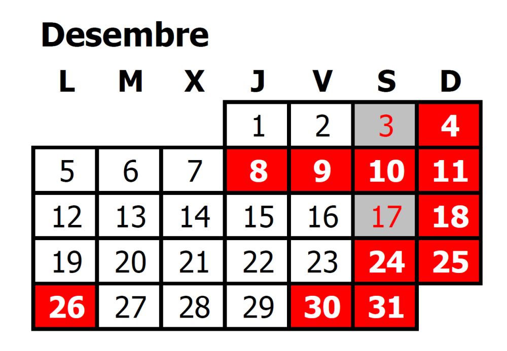 Us facilitem el calendari de Desembre i Gener els dies festius que fem en el Pont de la Immaculada i...